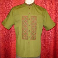 Високоякісна чисто бавовняна зелена тканина. На грудях по обидві сторони від планки з ґудзиками розташовані дві смуги машинної вишивки темно-зеленою і червоною нитками з традиційним узором, що поєднує в собі прямі та косі хрести і восьмикутну зірку. Смуги вишивки розташовані нетрадиційним способом – нижче рівня кокетки, край котрої декоративно прострочений червоною ниткою (фото 3).